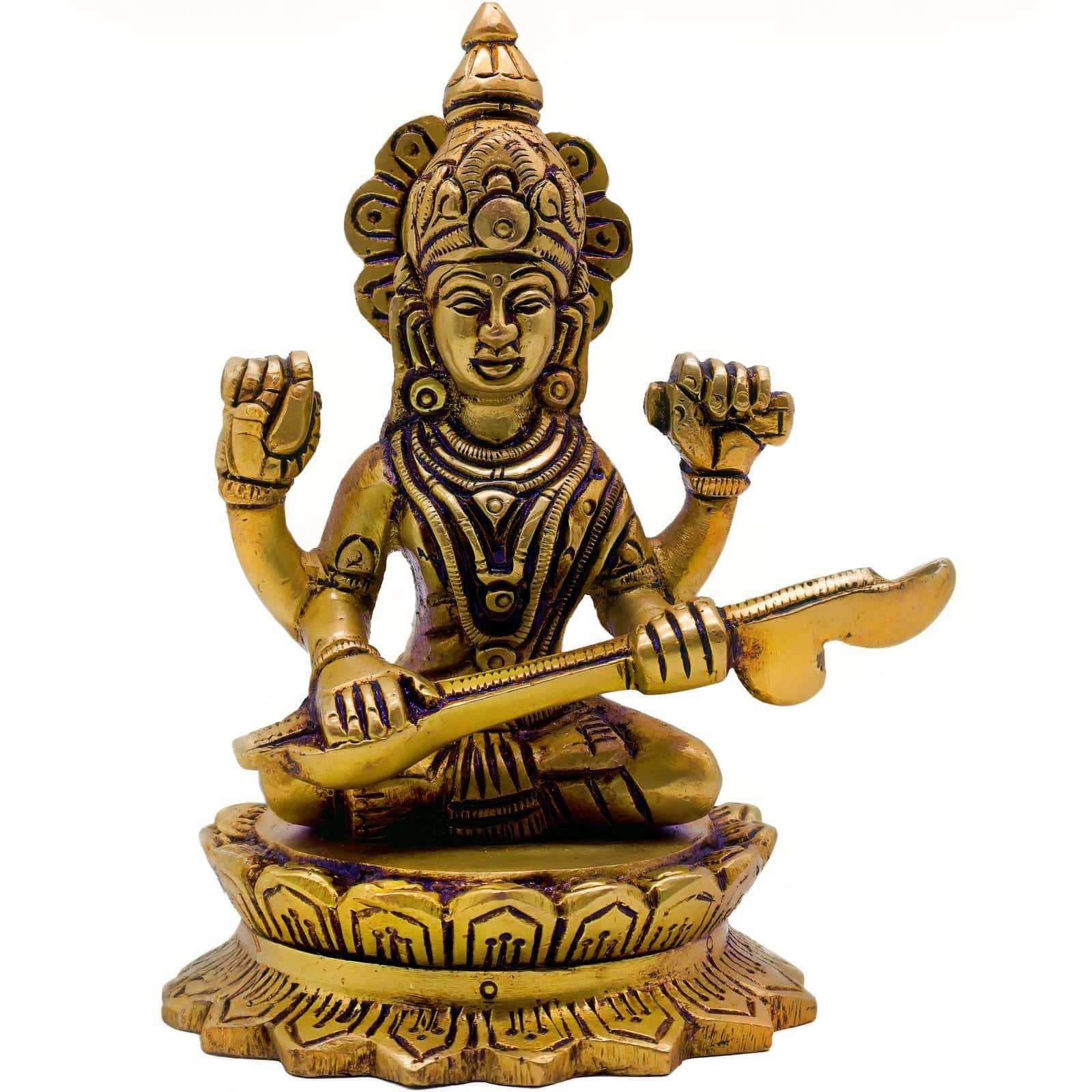 Crafted from solid brass and finished with intricate detailing, this piece makes an excellent addition to home temples, study areas, or as a thoughtful gift for students, teachers, and musicians. The lotus base symbolizes purity and spiritual awakening, enhancing the divine aura of the idol.